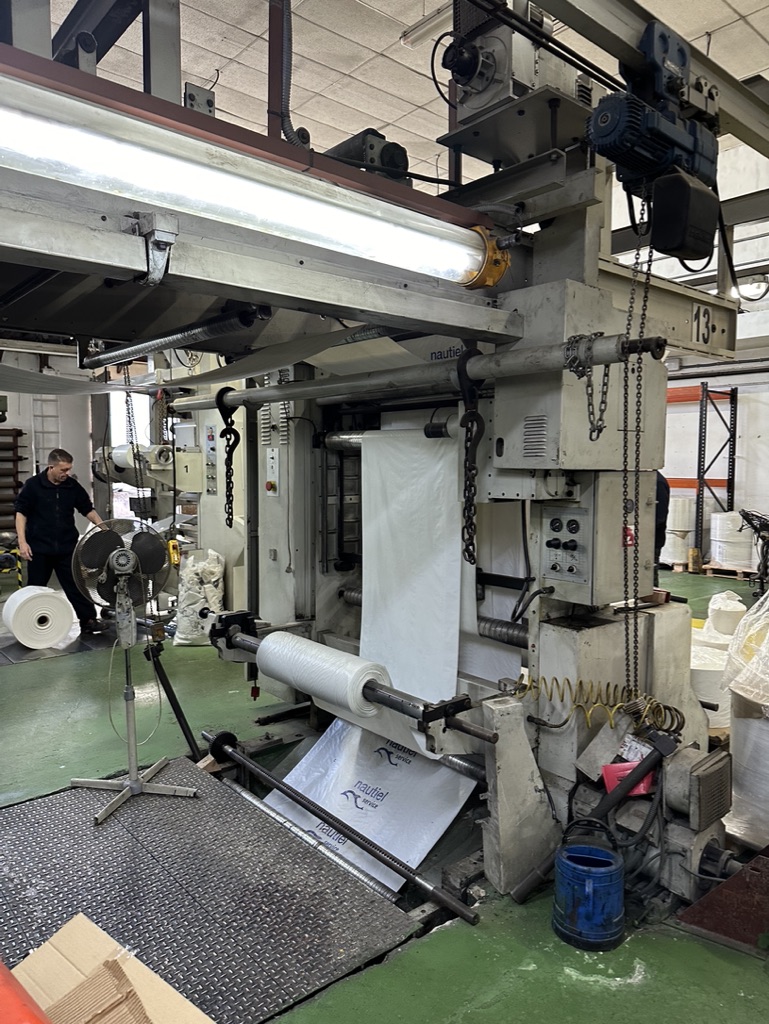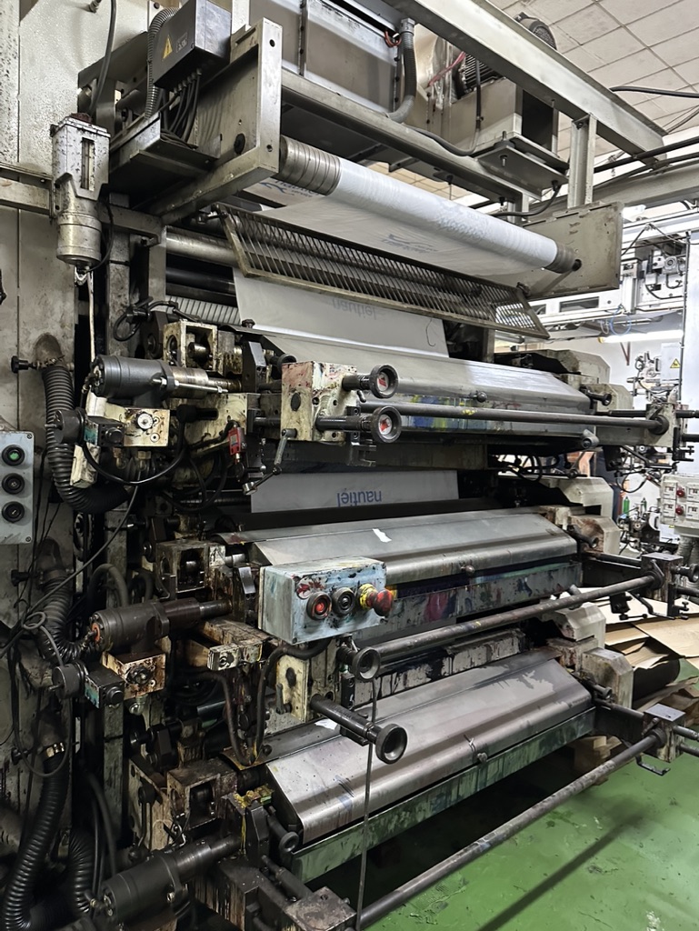 Impresora flexográfica de 1600 mm 6 colores, Sistema de Simple bobinador, Sistema de Simple desbobinador por freno, Diámetro Del Desbobinador: 800 mm, Diámetro Del Rebobinador: 800 mm, Velocidad Mecánica: 200 m/min, Sistema de secado con impulsión y expulsión, Sistema de control de tensión automática, Control de los rebobinadores independiente, Simple rebobinador con embragues neumáticos, Control del desbobinador con Freno magnético, Alineador de banda Electrónico, Polipastos dobles para cargar bobinas y rodillos, Equipos electrónicos totalmente nuevos.